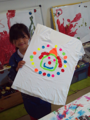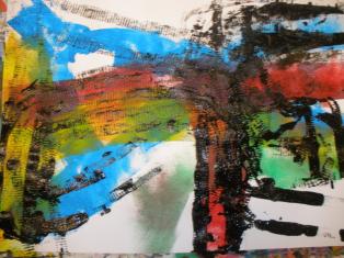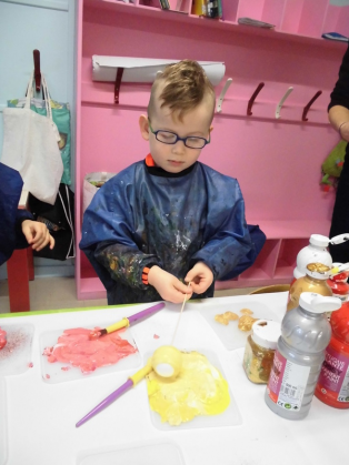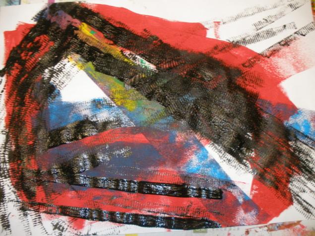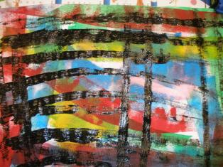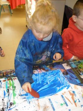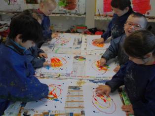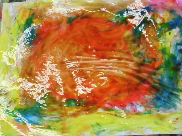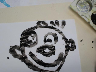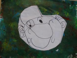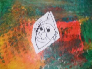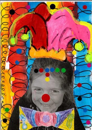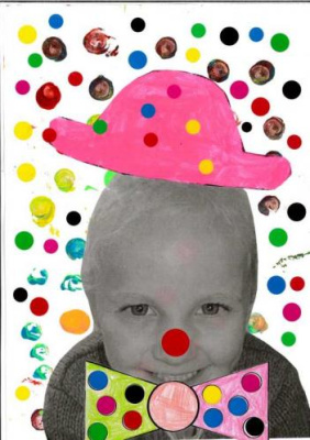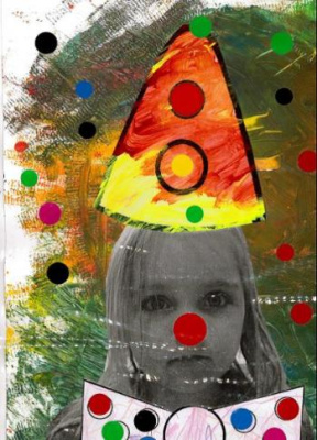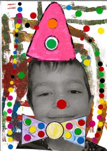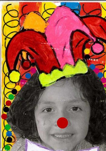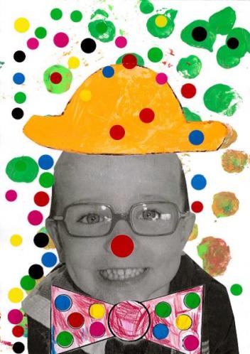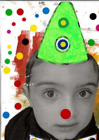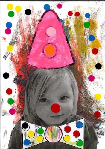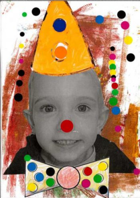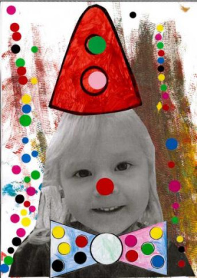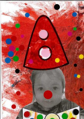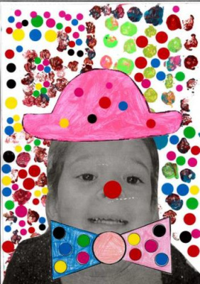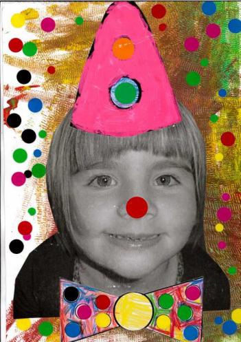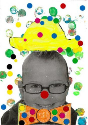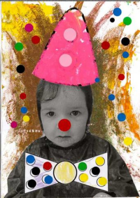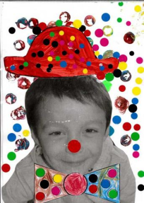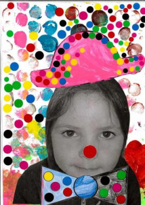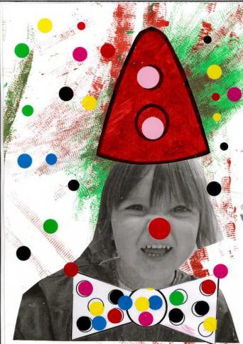 - Peindre un fond avec différents outils pour coller la tête de clown